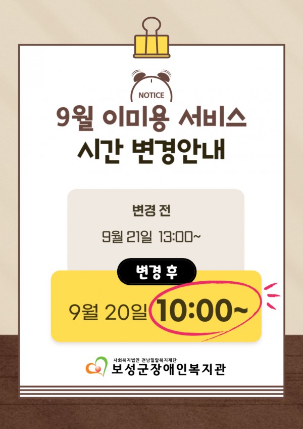 9월 이미용 서비스 시간 변경 안내 작성자 정보 이현진 작성 작성일 2023.09.15 14:24 컨텐츠 정보 1,250 조회 목록 본문 관련자료 이전 (5월)찾아가는 이미용서비스 작성일 2024.10.28 09:16 다음 9월 이.미용 서비스 안내 작성일 2023.08.30 10:14 댓글 0개 등록된 댓글이 없습니다. 로그인한 회원만 댓글 등록이 가능합니다. 목록